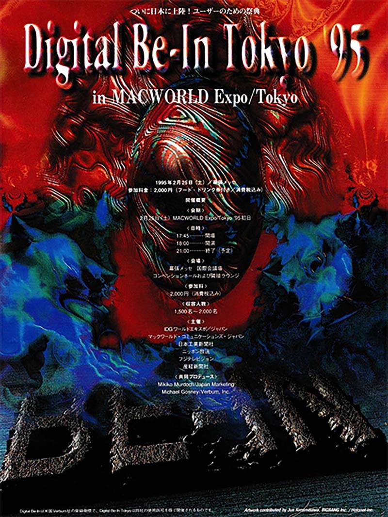 In 1995, Verbum‘s president Michael Gosney and Mikiko Murdoch along with IDG Japan organized a Be-In in Tokyo 95, Japan. There they had a video tape message from Timothy Leary, a presentation on the links between the 1960s counterculture of the Bay Area and the personal computer revolution, a Digital Art Gallery, and the Digital Frontier included exhibits by avant garde multimedia publishers.
